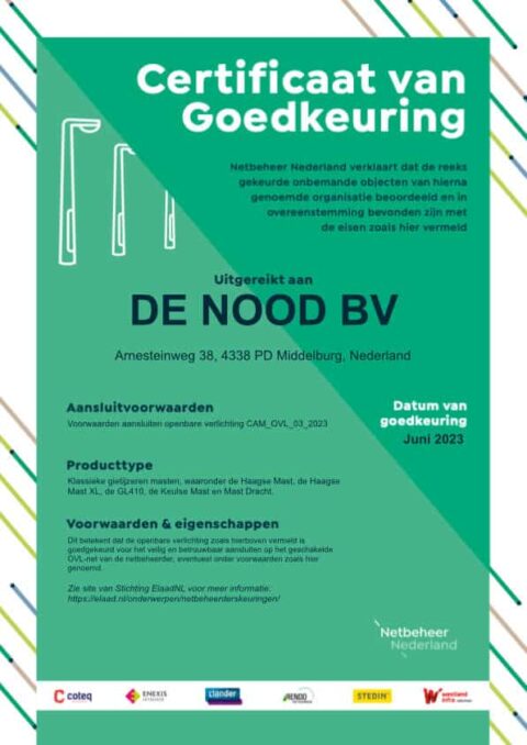 De eerste gietijzeren masten die veilig geplaatst kunnen worden volgens de netbeheerders zijn verkrijgbaar bij DE NOOD. De masten van DE NOOD hebben de keuring van ElaadNL succesvol doorlopen en zijn daarmee volledig gecertificeerd voor toepassing met de nieuwe CAM-OVL. Voor openbare verlichting is dat conform versie CAM-OVL-03-2023